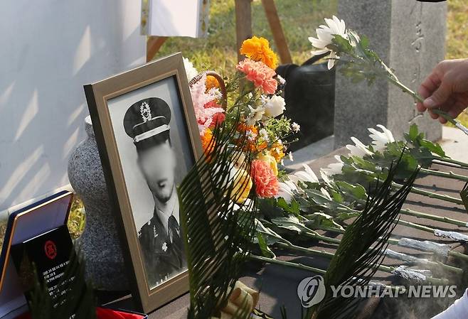 (서울=연합뉴스) 이정훈 기자 = 21일 오후 서울 동작구 국립서울현충원에서 열린 고 최 모 소위 진혼식에서 최 소위 가족이 헌화하고 있다.