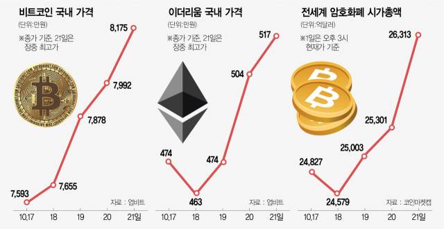 전 세계 암호화폐 시가총액 2위인 이더리움 역시 같은 시각 0.8% 오른 508만 원에 손바뀜이 이뤄지고 있다. 이더리움의 종가 기준 사상 최고가는 5월 11일의 512만 원이었다. 해외시장에서도 20일 4,164달러까지 오르며 5월 11일 사상 최고치였던 4,169달러에 바짝 다가섰다. 이에 힘입어 전 세계 암호화폐 시가총액은 사상 최대치를 경신했다. 21일 오후 3시 현재 2조 6,313억 달러로 종전 최고치인 5월 12일의 2조 5,600억 달러를 넘어섰다.