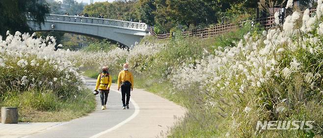 [전주=뉴시스] 김얼 기자 = 완연한 가을 날씨가 이어지고 있는 21일 전북 전주시 전주한옥마을 전주천변에서 시민들이 억새 사이를 지나며 산책을 즐기고 있다. 2021.10.21. pmkeul@newsis.com