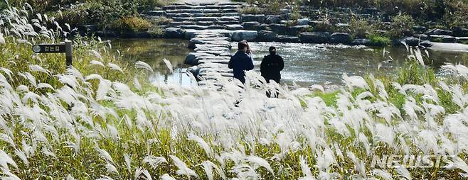 [전주=뉴시스] 김얼 기자 = 완연한 가을 날씨가 이어지고 있는 21일 전북 전주시 전주한옥마을 전주천변에서 시민들이 억새 사이를 지나며 산책을 즐기고 있다. 2021.10.21. pmkeul@newsis.com