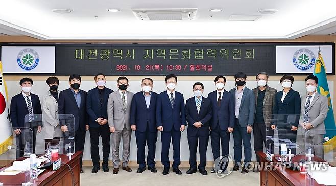 (대전=연합뉴스) 21일 대전시청 중회의실에서 열린 '지역문화협력위원회 위촉식'에서 허태정 대전시장과 위원들이 기념촬영을 하고 있다. 위원회는 지역 문화 진흥, 문화 격차 해소를 위한 시책을 심의한다. 2021.10.21 [대전시 제공. 재판매 및 DB 금지]