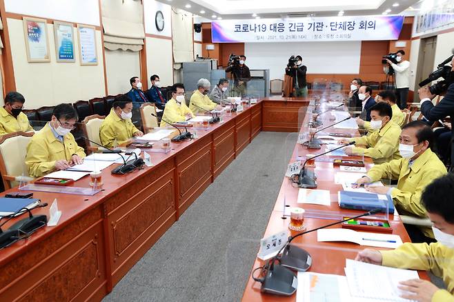 충북도는 21일 도청 소회의실에서 코로나19 대응 긴급 기관·단체장 회의를 열었다. 일부 시·군을 중심으로 확산세가 지속되는 데 따른 것이다.