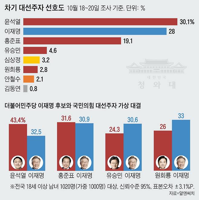 윤석열 43.4% vs 이재명 32.5%.. 홍준표 31.6% vs 이재명 30.9%