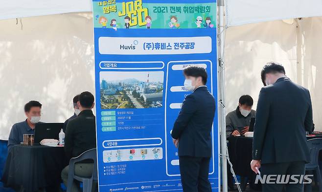 [전주=뉴시스] 김얼 기자 = 2021 전북 취업 박람회가 열린 21일 전북 전주시 전북지방중소벤처기업청 앞 광장에서 구직자들이 현장 면접을 위해 길게 줄 서 있다. 2021.10.21. pmkeul@newsis.com