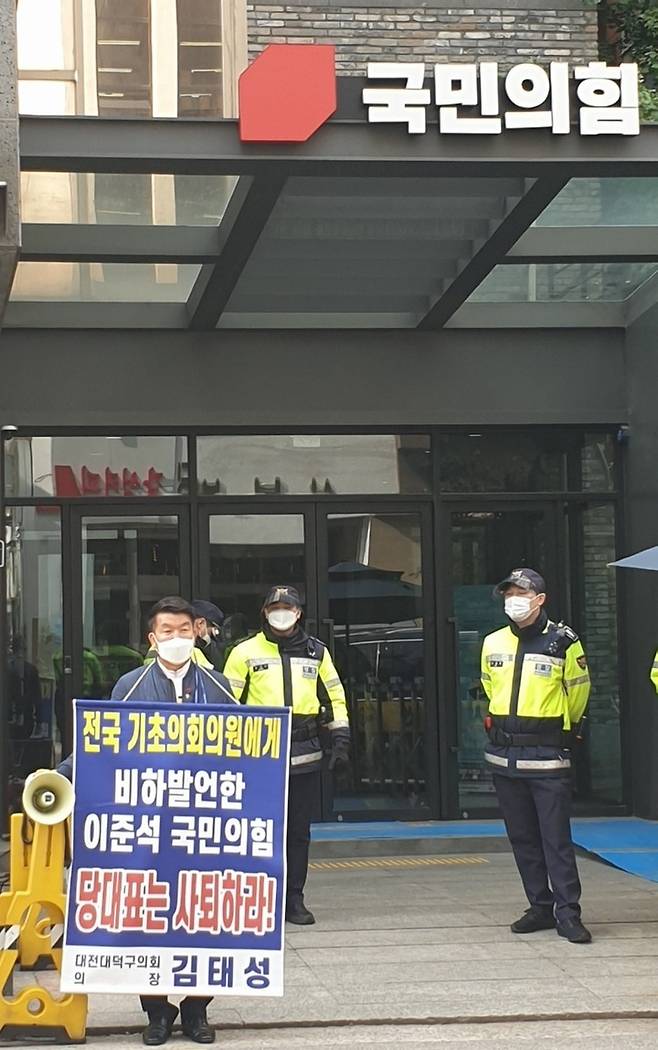 [대전=뉴시스] 조명휘 기자 = 김태성 대전 대덕구의회 의장이 21일 서울 여의도 국민의힘 중앙당사 앞에서 이준석 당대표의 기초의원 비하발언을 규탄하는 1인 시위를 하고 있다. (사진= 대덕구의회 제공) 2021.10.21. photo@newsis.com