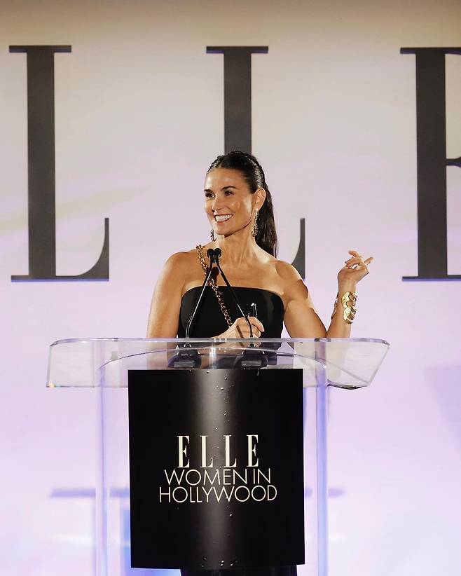 공개된 사진 속 데미 무어는 검은색 오프숄더 드레스 차림으로 포토월에서 포즈를 취한 모습이다. 이와 함께 단상에 올라 이야기를 하는 그의 모습에서는 여유로움이 느껴진다.