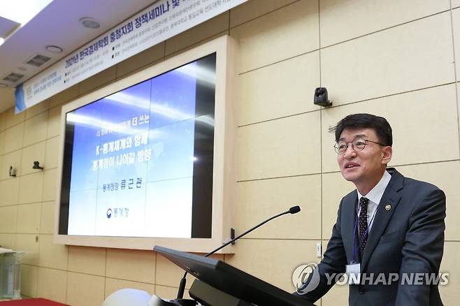 (서울=연합뉴스) 류근관 통계청장이 21일 대전 한남대학교 56주년기념관 중회의실에서 열린 '2021년 한국경제학회 충청지회 정책세미나 및 학술대회'에서 K-통계체계와 함께 통계청이 나아갈 방향이란 주제로 강연을 하고 있다. 2021.10.21