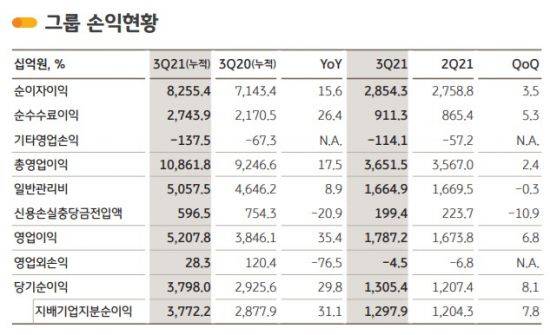 3분기 누적 기준으로는 당기순이익이 3조7722억원으로 전년동기 2조8779억원 대비 31.1%(8943억원) 증가했다. 지난해 전체 실적을 넘어선 것으로 역대 최대 실적이다. 누적 순이자이익은 15.6% 증가한 8조2554억원, 순수수료이익은 26.4% 늘어난 2조7439억원으로 집계됐다. 사업 부문별 핵심 비즈니스 강화를 통한 수익창출 기반 확대 및 인수합병(M&A)를 통한 비즈니스 포트폴리오 다각화 노력의 결과로 풀이된다.