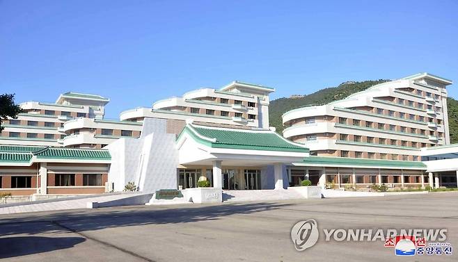 (평양 조선중앙통신=연합뉴스) 북한 황해북도 정방산 기슭에 3개 호동과 운동실, 수영장 등을 갖춘 정방산호텔이 지난 20일 준공됐다고 조선중앙통신이 21일 보도했다. 2021.10.21