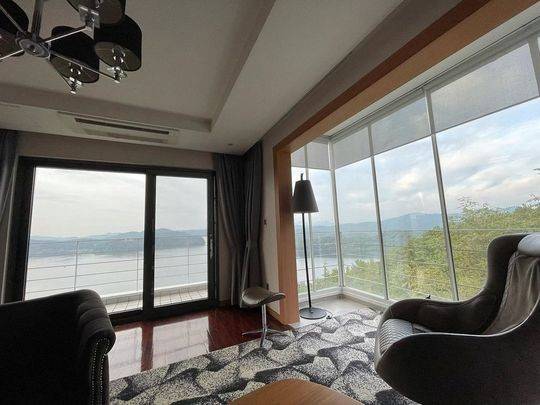 사진에는 고풍스러운 호텔 내부가 담겼다. 창 밖으로 보이는 아름다운 자연 풍광이 아름답다. 특히 통창으로 탁트인 전망이 이목을 집중시킨다.