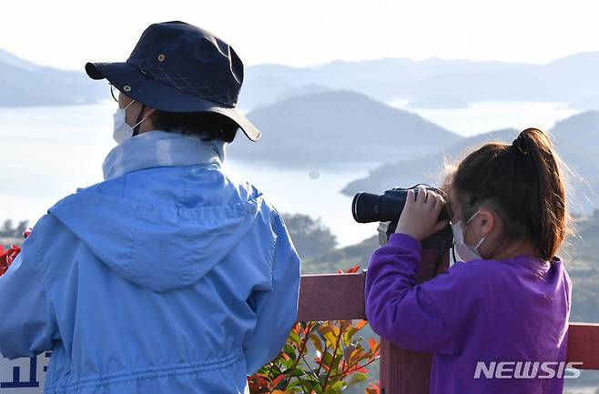 [고흥=뉴시스] 변재훈 기자 = 21일 오후 전남 고흥군 영남면 고흥우주발사전망대에서 한 관람객이 쌍안경을 이용해 한국형 발사체 '누리호'(KSLV-II) 발사 직전 나로우주센터를 바라보고 있다. 2021.10.21. wisdom21@newsis.com