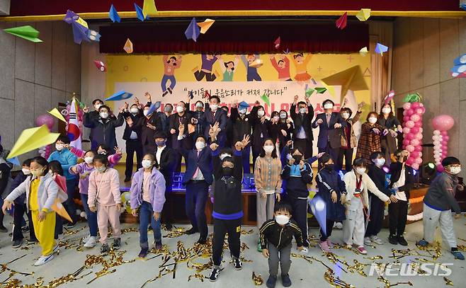 [대구=뉴시스] 이무열 기자 = 21일 오후 대구 달서구청 대강당에서 열린 유니세프 아동친화도시 인증 선포식에서 어린이들이 종이비행기를 날리고 있다. 2021.10.21. lmy@newsis.com