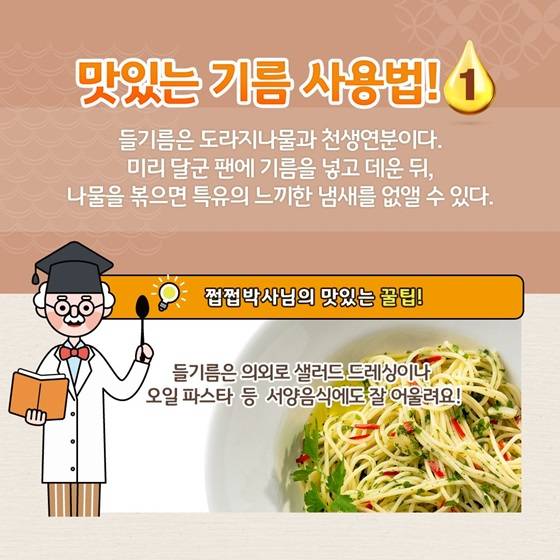 재료의 풍미를 더하고 음식의 품격을 높이는 한식의 숨은 공신 '기름' 몸에 좋은 기능 성분을 두루 갖춘 기름 삼총사의 매력을 파헤쳐 볼까요? ◆ 식물성 오메가-3의 왕! '들깨' 들기름은 오메가-3 계열의 알파-리놀렌산이 60%이상 들어 있다.