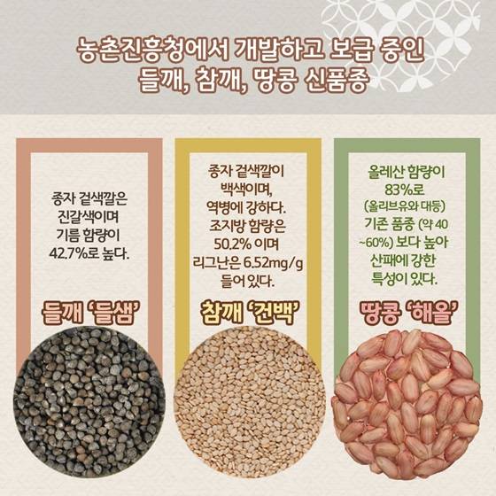 ◆ 농촌진흥청에서 개발하고 보급 중인 들깨, 참깨, 땅콩 신품종