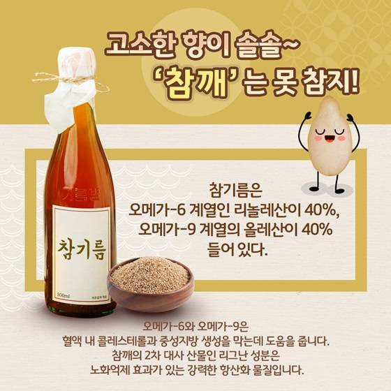 참기름은 오메가-6 계열인 리놀레산이 40%,