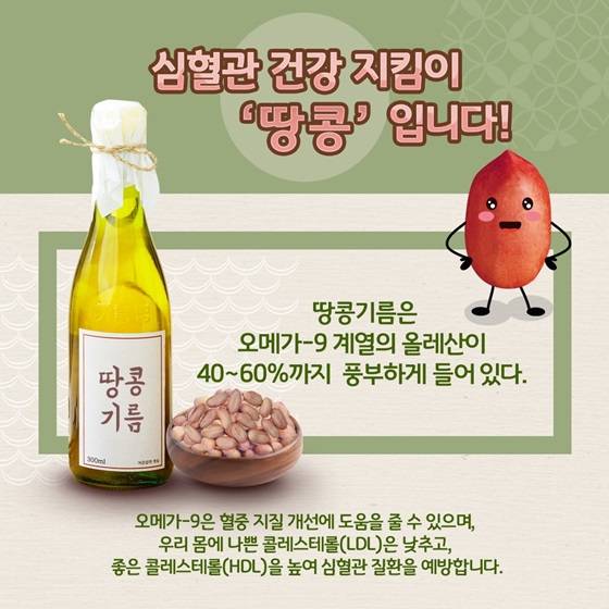 땅콩기름은 오메가-9 계열의 올레산이 40~60%까지 풍부하게 들어 있다.