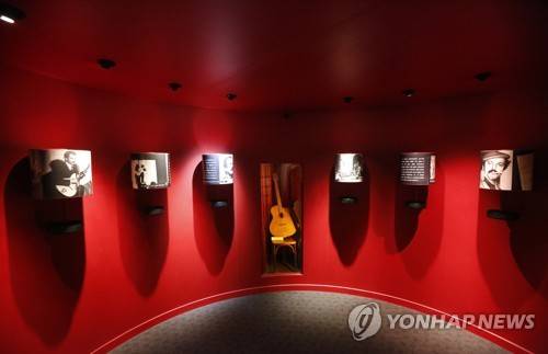epa09535475 A guitar is displayed at an exhibition on French singer and poet Georges Brassens in the Espace Georges Brassens museum, in Sete, France, 20 October 2021 (issued 21 October 2021). The city of Sete will celebrate on 22 October 2021, the centenary of the birth of French singer-songwriter and poet Georges Brassens. EPA/GUILLAUME HORCAJUELO