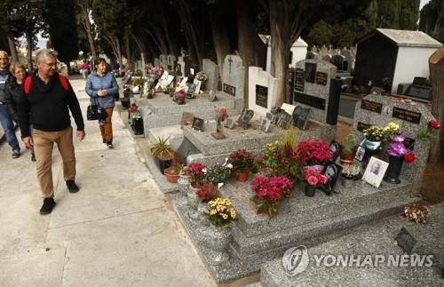 epa09535476 Tourists walk near the tomb of French singer and poet Georges Brassens (R), in the cemetery of Le Py, in Sete, France, 20 October 2021 (issued 21 October 2021). The city of Sete will celebrate on 22 October 2021, the centenary of the birth of French singer-songwriter and poet Georges Brassens. EPA/GUILLAUME HORCAJUELO