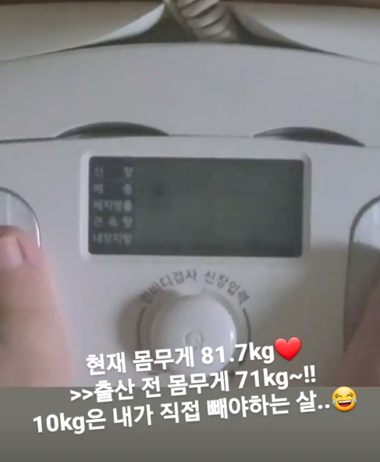 공개된 영상에는 황신영이 오른 체중계가 담겼다. 81.7kg의 현재 몸무게를 밝힌 황신영은 "출산 전 몸무게 71kg~!!10kg은 내가 직접 빼야 하는 살…"이라고 변화된 몸의 상태를 전했다.