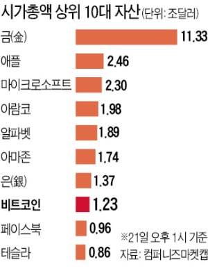 비트코인의 시가총액은 1조2300억달러(약 1450조원)로 불어나 페이스북, 테슬라, 벅셔해서웨이 등을 제쳤다. ‘디지털 은(銀)’ 이더리움 시총은 4936억달러(약 580조원)로 알리바바, 존슨앤드존슨, 삼성전자 등을 앞질렀다.