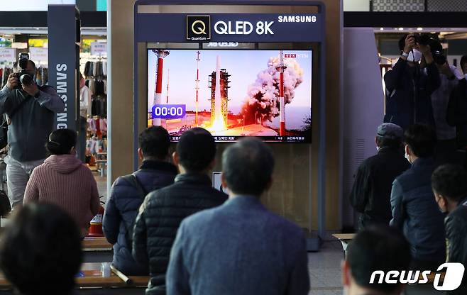 (서울=뉴스1) 이승배 기자 = 21일 서울 중구 서울역 대합실에서 시민들이 한국형 발사체 누리호(KSLV-II)의 발사 장면을 TV를 통해 시청하고 있다. 2021.10.21/뉴스1