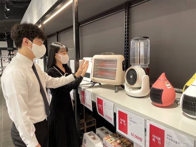 64년 만에 찾아온 ‘가을 한파’에 21일 전자랜드 타이푼을 방문한 고객들이 난방 제품을 살펴 보고 있다. 전자랜드에 따르면 지난 12일부터 일주일간 전자랜드 전국 매장의 판매량이 전년 동기 대비 전기장판(전기·온수매트)은 68%, 전열기기는 79%, 온풍기는 98% 증가했다. /연합뉴스