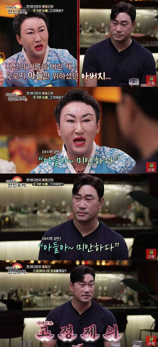 이날 '만신포차'에서 봉중근은 부상으로 인해 야구를 포기하게 된 일화를 비롯해 재혼 후 결혼생활, 스포테이너로서의 꿈 등 다양한 고민을 털어놨다.