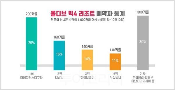 이어 2위 디갈리 16%(160커플), 3위 하이더웨이 14%(140커플), 4위 두짓타니 11%(110커플) 등이 꼽혔다.