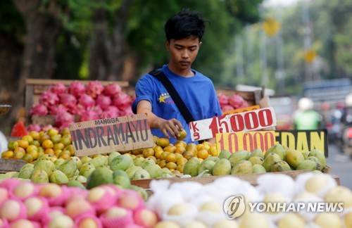 epa09535525 Street fruits vendor serves customers at a street in Jakarta, Indonesia, 21 October 2021. EPA/ADI WEDA