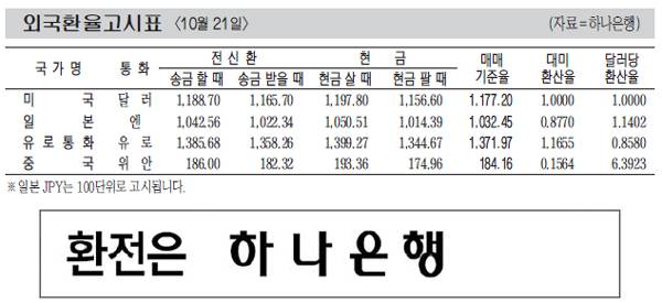 [표] 외국환율고시표 (10월 21일)