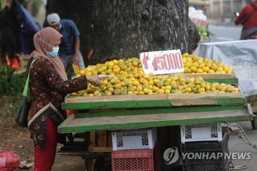 epa09535528 A fruits vendor waits for customers at a street in Jakarta, Indonesia, 21 October 2021. EPA/ADI WEDA