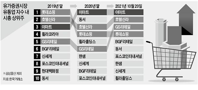 21일 한국거래소에 따르면 이날 종가 기준 유가증권시장 유통업지수 내 시총 1위 종목은 이마트다. 코로나19 팬데믹(대유행) 이전인 2019년 말 3위였던 이마트는 이제 국내 유통 대장주로 자리매김했다. 시총은 약 4조5000억원으로, 2년 새 20% 이상 늘었다. 2019년 말 국내 유통 대장주 자리에 앉아 있던 롯데쇼핑은 유통업 내 시총 4위까지 밀려났다. 사실상 삼성그룹 지주사 역할을 하고 있는 삼성물산은 제외한 순위다. 코스피 유통업 지수는 한국거래소가 사업별 매출 비중 등을 고려해 도·소매업종으로 분류한 종목을 담고 있다.