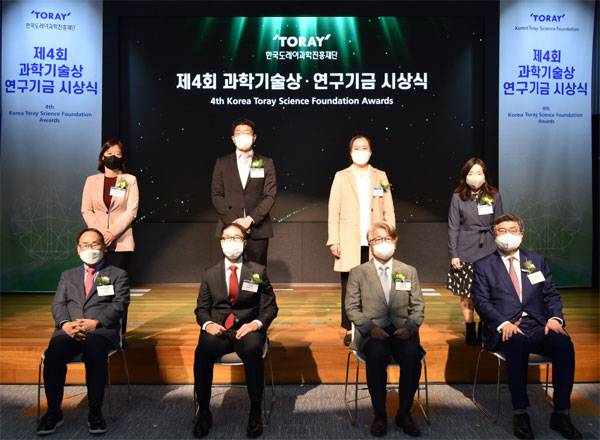 21일 한국도레이과학진흥재단이 서울 강서구 마곡동 한국도레이R&D센터에서 '제4회 한국도레이 과학기술상·연구기금 시상식'을 열었다. 앞줄 왼쪽부터 이영관 이사장, 조민행 고려대 화학과 교수, 박수영 서울대 재료공학부 교수, 차국현 상운영위원장 등이 기념촬영을 하고 있다.
