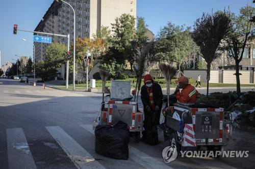 epa09535592 Cleaners rest near a residential area in Beijing, China, 21 October 2021. EPA/WU HONG