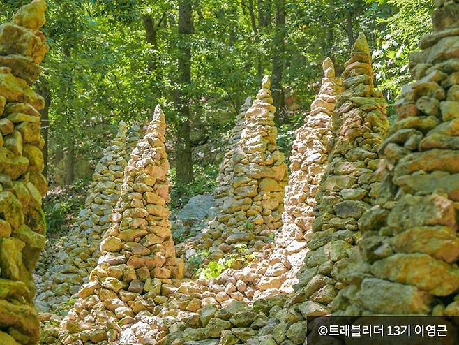 입구에서부터 등산로 곳곳에 돌탑들이 즐비해 있는데요. 이는 산자락에서 거주 중인 이삼용 씨가 남북통일을 기원하는 마음으로 1990년대부터 하나하나 쌓아 만든 것이라고 합니다. 견고하게 쌓인 돌탑들을 보면서 그 정성을 느낄 수 있습니다.