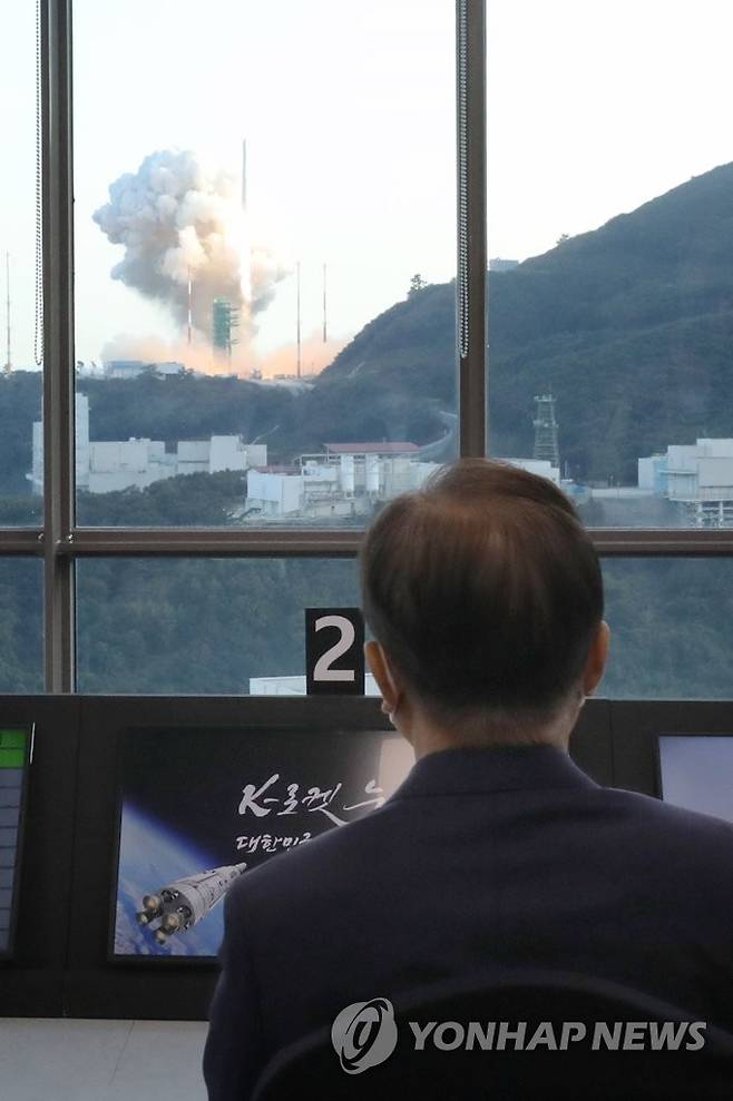 (고흥=연합뉴스) 최재구 기자 = 문재인 대통령이 21일 오후 전남 고흥 나로우주센터 연구동에서 김진한 한국항공우주연구원 책임연구원의 설명을 들으며 한국형 발사체 '누리호(KSLV-2)'의 발사를 참관하고 있다. 2021.10.21