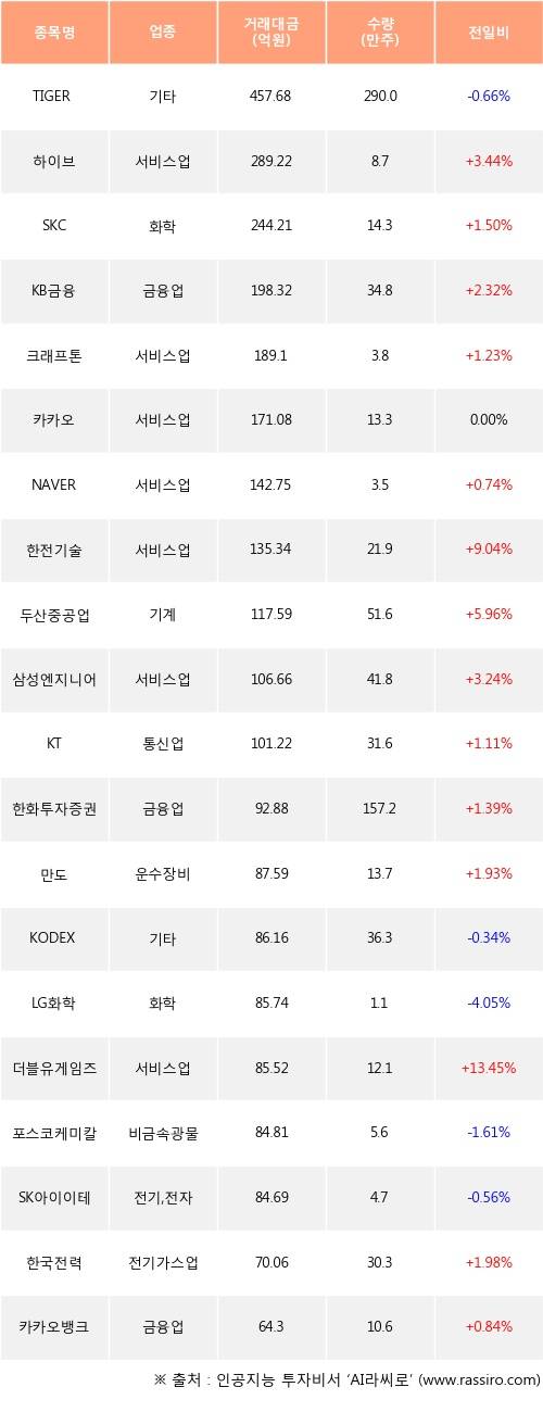 하이브, SKC, KB금융 등은 전일 대비 주가가 상승했고, TIGER MSCI Korea TR, KODEX 레버리지, LG화학 등은 주가가 하락했다.