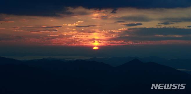 [남해=뉴시스] 차용현 기자 = 21일 오후 경남 남해군 망운산 정상에서 바라본 서쪽 하늘에 아름다운 석양이 지고 있다. 2021.10.21. con@newsis.com