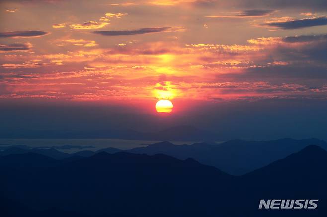 [남해=뉴시스] 차용현 기자 = 21일 오후 경남 남해군 망운산 정상에서 바라본 서쪽 하늘에 아름다운 석양이 지고 있다. 2021.10.21. con@newsis.com