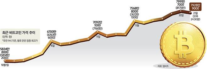 국내 가상화폐 거래소에서는 업비트 기준으로 지난 4월14일 기록한 8199만원이 최고가로 남아있다. 지난 밤 비트코인은 업비트에서 8175만원까지 오르며 최고가에 근접했다가 다소 하락해 21일 오후 7800만~7900만원대에 거래됐다.