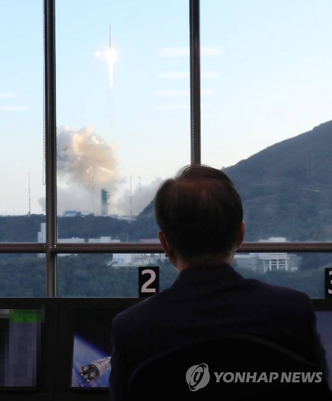 (고흥=연합뉴스) 최재구 기자 = 문재인 대통령이 21일 오후 전남 고흥 나로우주센터 연구동에서 한국형 발사체 '누리호(KSLV-2)'의 발사를 참관하고 있다. 2021.10.21