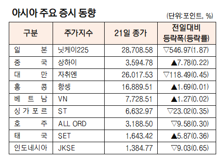 [표]아시아 주요 증시 동향(10월 21일)