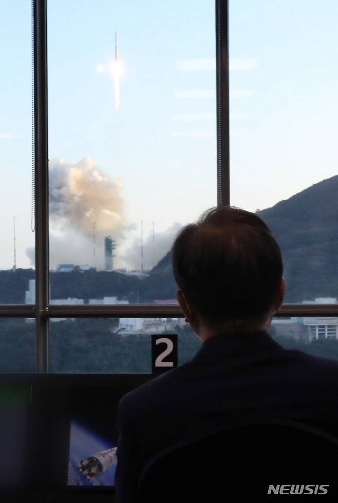 [고흥=뉴시스] 전진환 기자 = 문재인 대통령이 21일 오후 전남 고흥 나로우주센터 연구동에서 한국형 발사체 '누리호(KSLV-2)'의 발사를 참관하고 있다. 2021.10.21. amin2@newsis.com