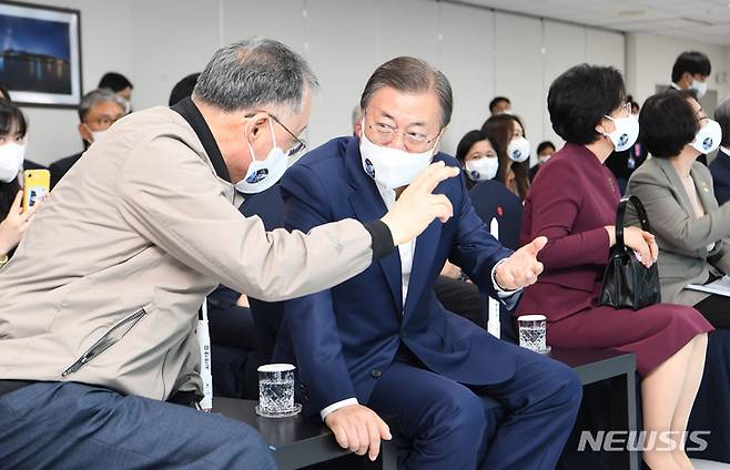 [고흥=뉴시스] 전진환 기자 = 문재인 대통령이 21일 오후 전남 고흥 나로우주센터 연구동에서 한국형 발사체 '누리호(KSLV-2)'의 발사를 참관, 이상률 한국항공우주연구원장과 대화하고 있다. 2021.10.21. amin2@newsis.com