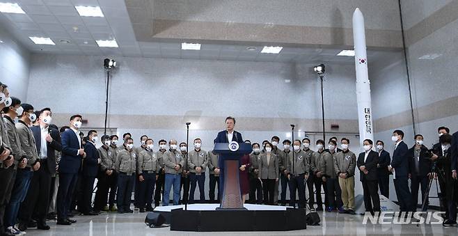 [고흥=뉴시스] 전진환 기자 = 문재인 대통령이 21일 오후 한국형 발사체 '누리호(KSLV-2)'의 발사 참관을 마치고 전남 고흥 나로우주센터 발사통제동에서 대국민 메시지를 발표하고 있다. 2021.10.21. amin2@newsis.com