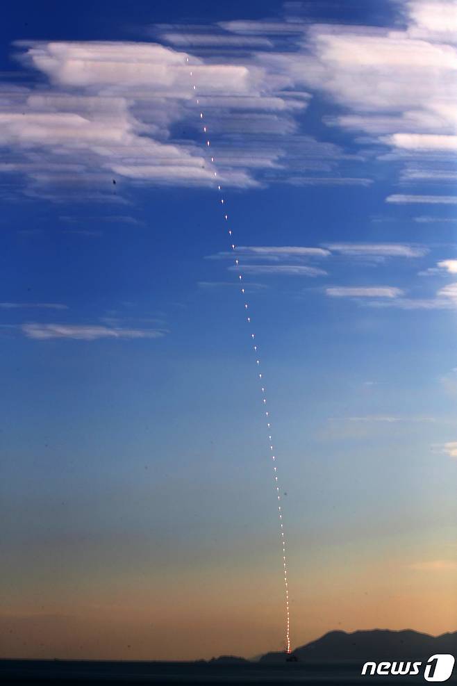 (여수=뉴스1) 조태형 기자 = '한국형 발사체' 누리호가 21일 오후 전남 고흥군 나로우주센터에서 발사되고 있다.
