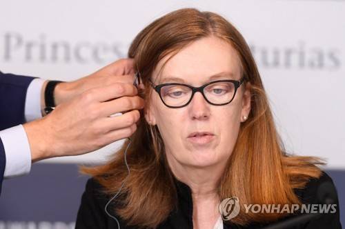 epa09535672 British scientist Sarah Gilbert is helped with an earphone shortly before she addresses a press conference at Hotel Reconquista in Oviedo, Spain, 21 October 2021. Gilbert is one of the seven experts who won 2021 Princess of Asturias Award for Technical and Scientific Research for contributing to the development of some of the vaccines approved to date, all based on different strategies, but which have protein S as a common target. The Princess of Asturias awarding ceremony will be held at Campoamor Theater in Oviedo on 22 October 2021. EPA/Eloy Alonso