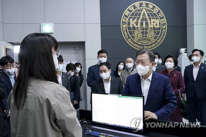 (고흥=연합뉴스) 최재구 기자 = 문재인 대통령이 21일 오후 한국형 발사체 '누리호(KSLV-2)'의 발사 참관을 마치고 전남 고흥 나로우주센터 발사통제관리실을 찾아 연구원들을 격려하고 있다. 2021.10.21