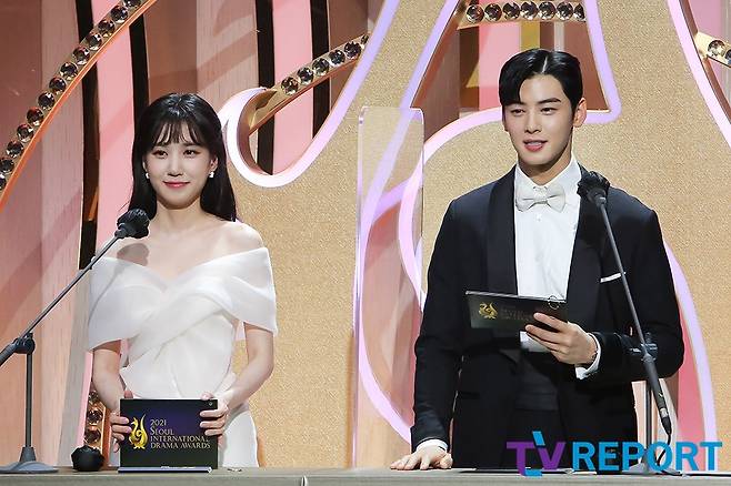 [TV리포트=백수연 기자] 배우 박은빈, 그룹 '아스트로' 차은우가 21일 오후 서울 상암 MBC 공개홀에서 진행된 '서울드라마어워즈 2021'에서 사회를 보고 있다.