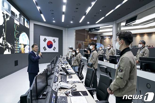 (고흥=뉴스1) 이광호 기자 = 문재인 대통령이 21일 오후 전남 고흥 나로우주센터 연구동에서 한국형 발사체 '누리호(KSLV-II)' 발사 참관을 마치고 발사통제관리실을 찾아 연구원들을 격려하고 있다. 2021.10.21/뉴스1
